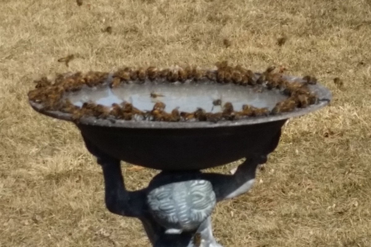 I advised her that the bees would probably enjoy a bit of sugar water, mixed in a ratio of one part water and one part sugar. She put it in her bird path by the deck and spent the rest of the afternoon refilling it as the bees waited for their turn at the trough.