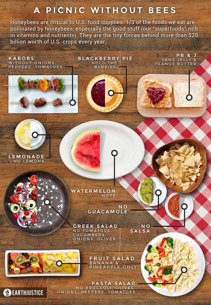 A lot would change without our pollinators. I was inspired to check out a Thanksgiving without bees after I saw “A Picnic without Bees” image below from Earth Justice, an environmental law organization based in San Francisco. Other organizations have created similar illustrations designed to help us envision a world without pollinators.